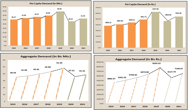 The major regular research project carried out by M.R.Division is the estimation of domestic consumption/demand pattern of textiles in the Household sector of the country. The report is based on the longitudinal survey, “National Household Survey: Market for Textile and Clothing (MTC)”published annually depicts the demand pattern of textiles in the household sector of the country on the basis of key variables like per capita consumption, aggregate demand of sectoral cum regional preferences, market size on the basis of the fibre category and products, etc. This is the only comprehensive report available on domestic demand of textiles for the household sector in the country.